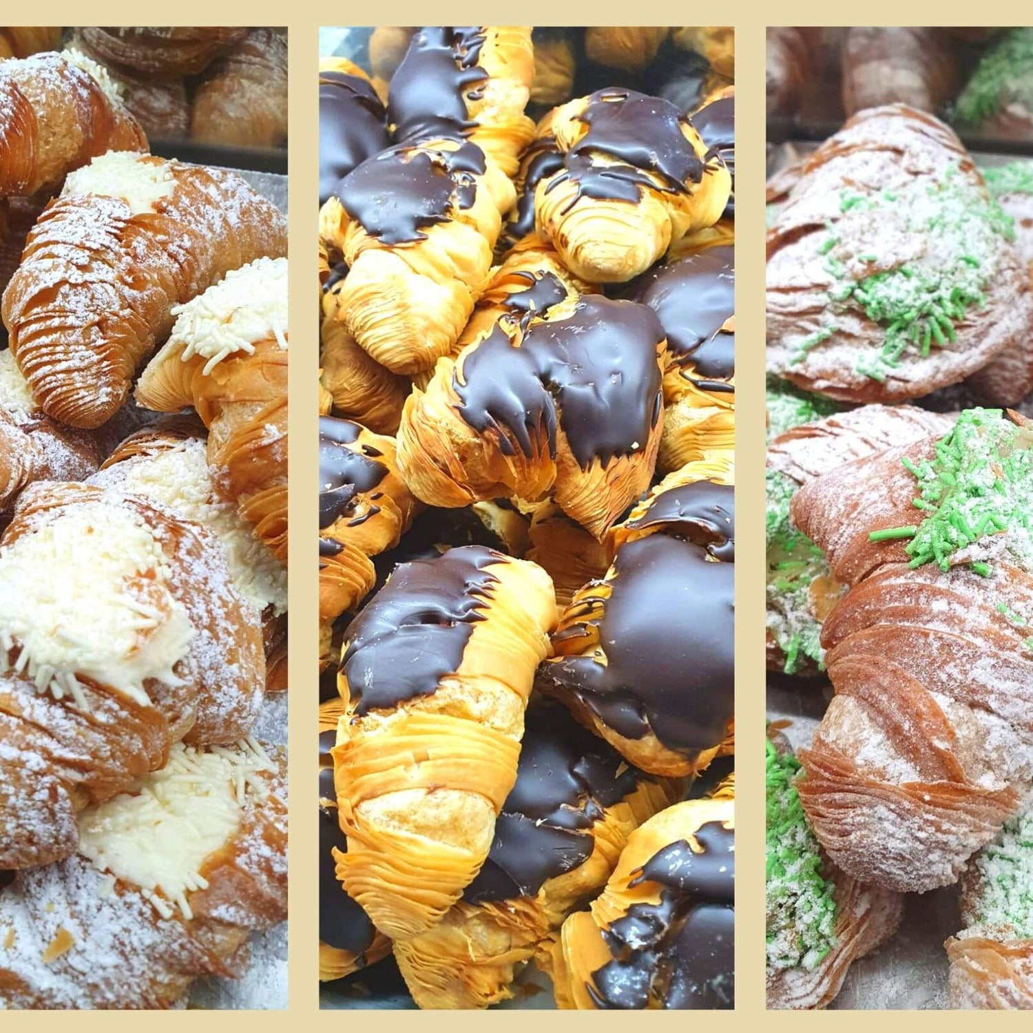 Ingredienti: farina "00", uova, burro, acqua, sale. Farcitura: cioccolato spalmabile alle nocciole, cioccolato bianco e cioccolato al pistacchio.